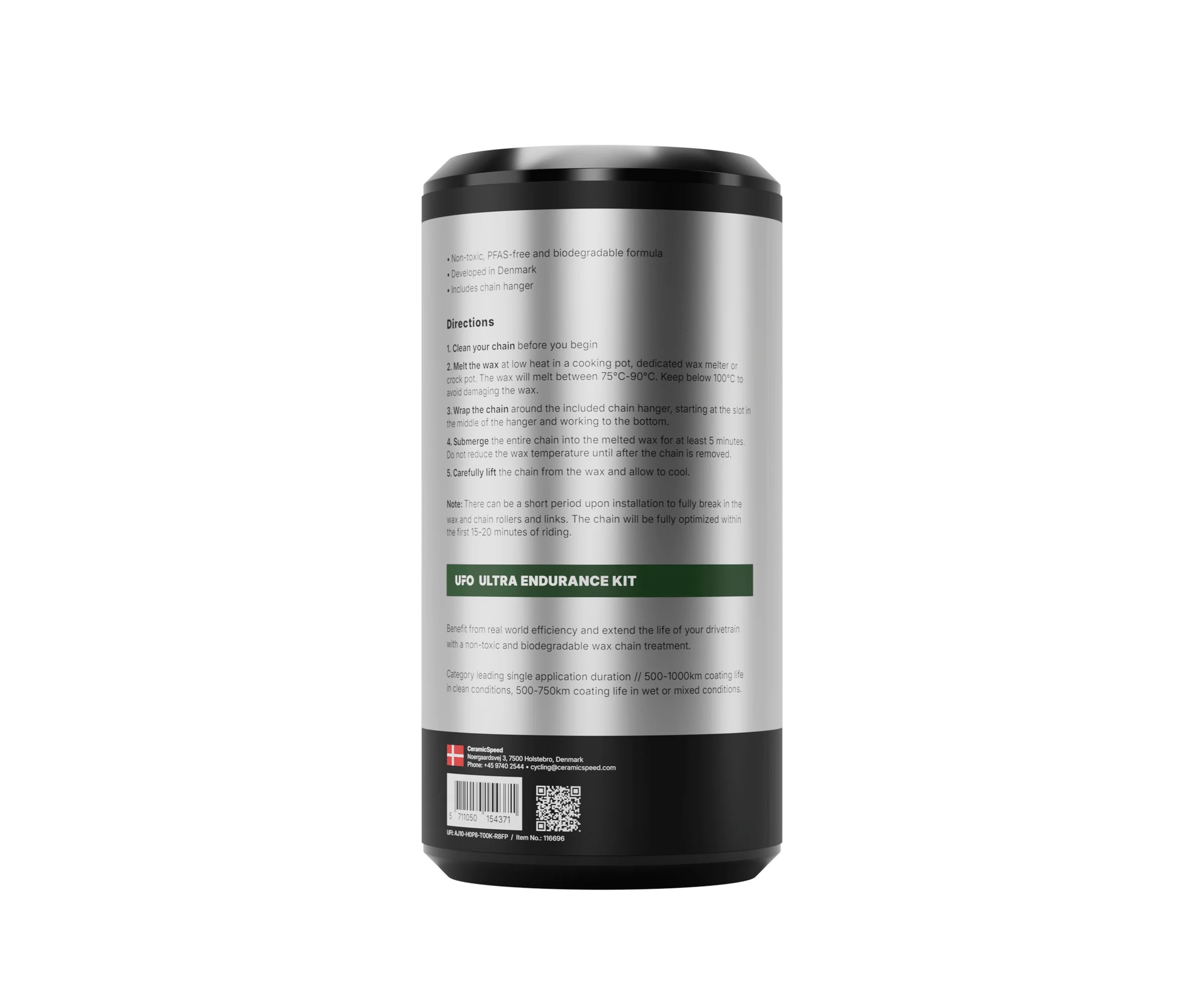 UFO WAX Ultra Endurance je dolgotrajno mazivo za verige z voskom, zasnovano za daljše vožnje v zahtevnih in mešanih pogojih. Zagotavlja nizko trenje, dolgotrajno zaščito in zmanjšano kontaminacijo, zaradi česar je idealno za vzdržljivostne kolesarje, ki si želijo dosledne zmogljivosti skozi več ur. Ta komplet je dobavljen v edinstveni toplotno odporni embalaži z jeklenko, ki ponuja enostaven način za uporabnike, ki prvič uporabljajo vosek, ali tiste, ki nimajo namenskega talilnika voska, da uporabijo dvojni kotel z vročo vodno kopeljo za taljenje voska in obdelavo lastnih verig. Priloženo je 400 g voščenih peletov in inovativno oblikovan obešalnik za verigo, ki preprečuje zapletanje verige med potopitvijo in obdelavo.