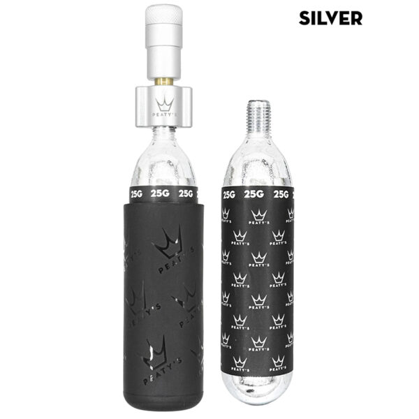 Set vsebuje: 1x Peaty’s Holeshot CO₂ tlačilka, 2x 25g CO₂ bombica ter 1x silikonska zaščita proti zmrzovanju