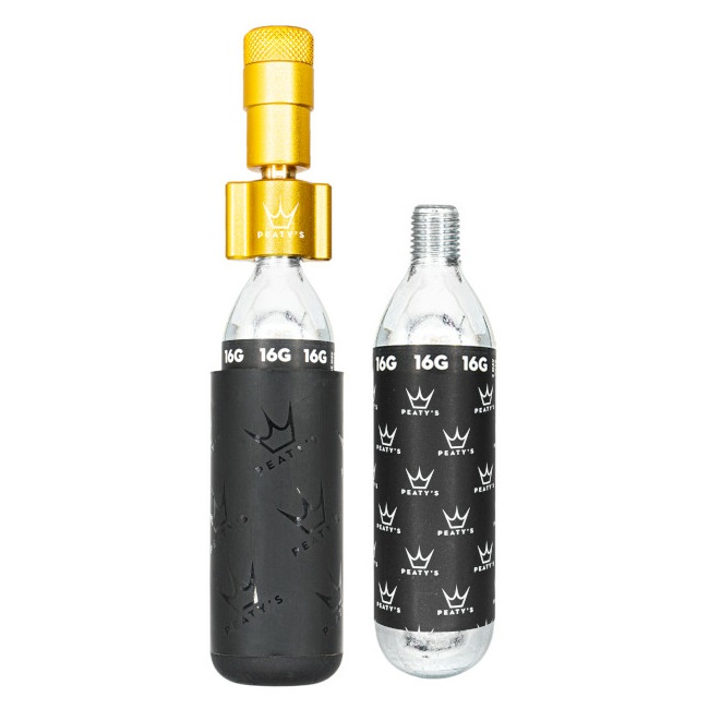 Set vsebuje: 1x Peaty’s Holeshot CO₂ tlačilka, 2x 16g CO₂ bombica ter 1x silikonska zaščita proti zmrzovanju